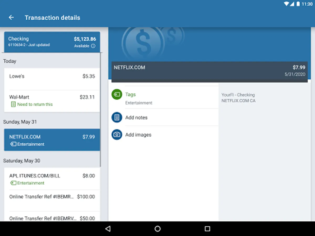 Add Tags, Notes, Images & Geo-Information: By enhancing transactions with custom tags, notes or photos of a receipt or check, you have the ability to stay organized and find exactly what you’re looking for when searching through your finances.