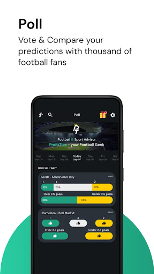 With the ProfitTips app, it is now easier than ever to compare your opinion for certain matches, against that of thousands of other users, for free! ProfitTips Poll allows you to vote on the outcome, and the amount of goals, in a given match.