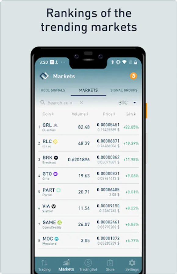 Just write the coin, buy and sell really quickly with the trading bot. Take advantage from others buying when the price is still rising. You will love trading with this app.