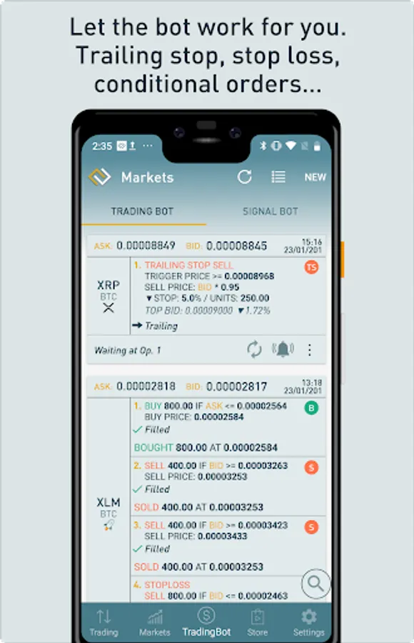 Get profits with conditional orders. Configure the market, the coin and the buying and selling prices and let the bot place the orders for you, so you just have to wait and get your profits. Place an optional stoploss to be able to control disadvantage market conditions.