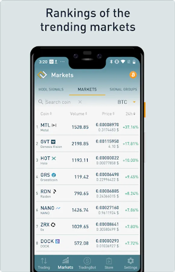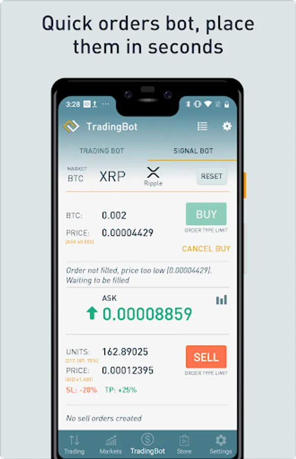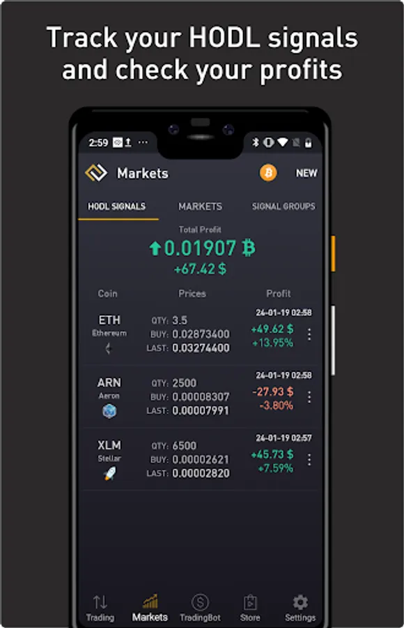 Just write the coin, buy and sell really quickly with the trading bot. Take advantage from others buying when the price is still rising. You will love trading with this app.
