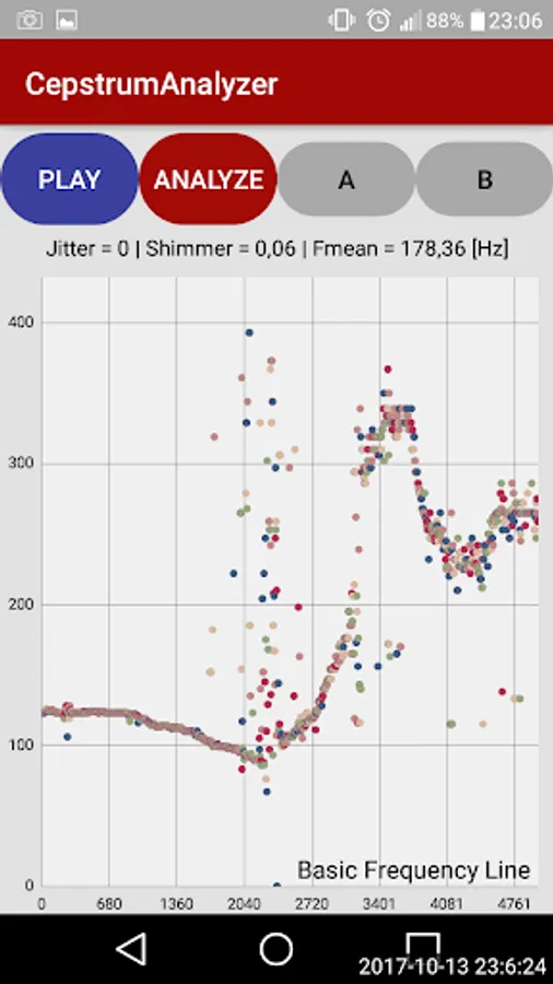 The program allows you to extract the fundamental frequency of the recorded audio samples. The algorithm is based on the Cepstral analysis returns the value F0 to an accuracy of 0.01 [Hz]. In addition, the parameters are calculated jitter and shimmer talking about frequency variations and amplitude variations. After recording 5-second audio samples, the analysis is made - in effect, a line graph is generated and returned F0 parameters are fundamental frequency, jitter and shimmer.