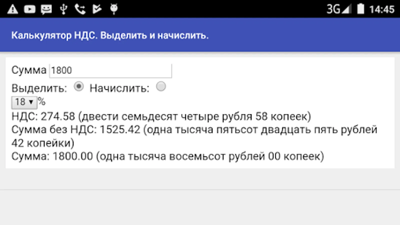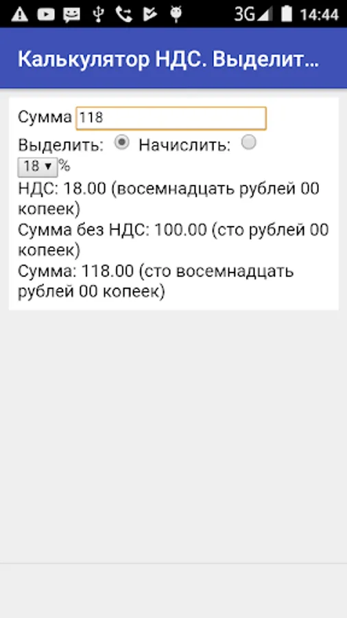 The calculator allows you to quickly calculate the VAT on basic rates of 18% and Russia 10%. Basic operations - selection and assessment. The result of the calculation is represented by numbers and words to quickly fill in forms.