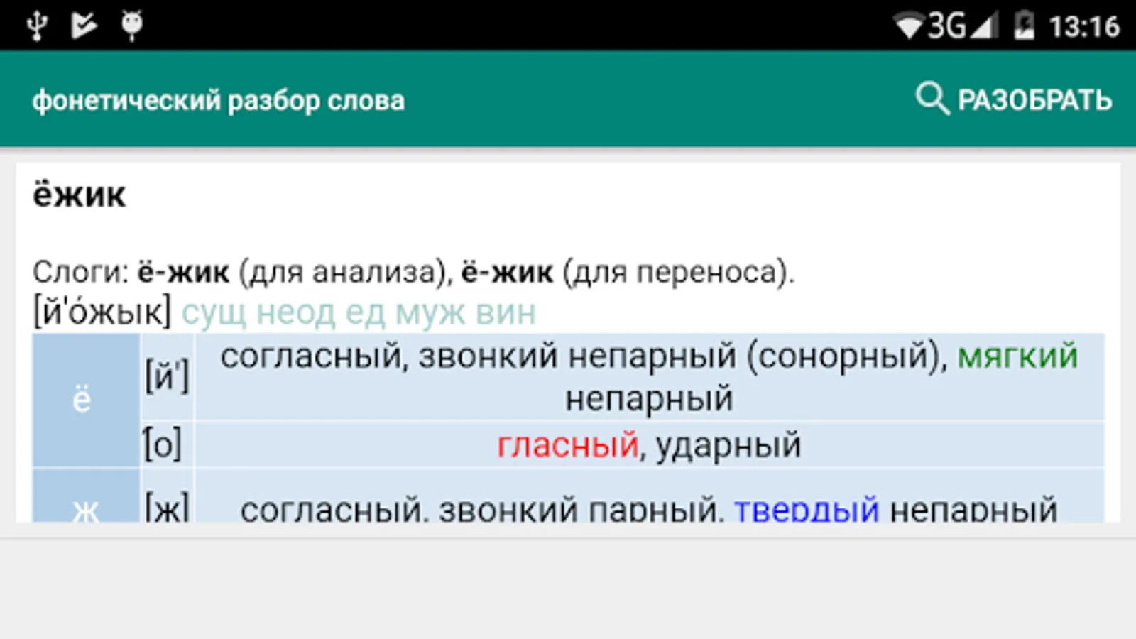 In the program, the parsing is taking into account the morphology (for example, the endings of adjectives), the letter e is taken into account, before which a solid paired consonant is pronounced or which is pronounced without iotation (for example, an applicant).