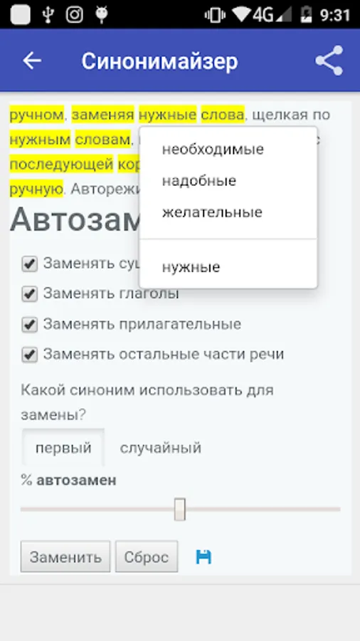 The Sinonyimizer text editor with correction for Russian texts allows you to find synonyms for words in the text without losing meaning. This can be used to enhance the uniqueness of texts.