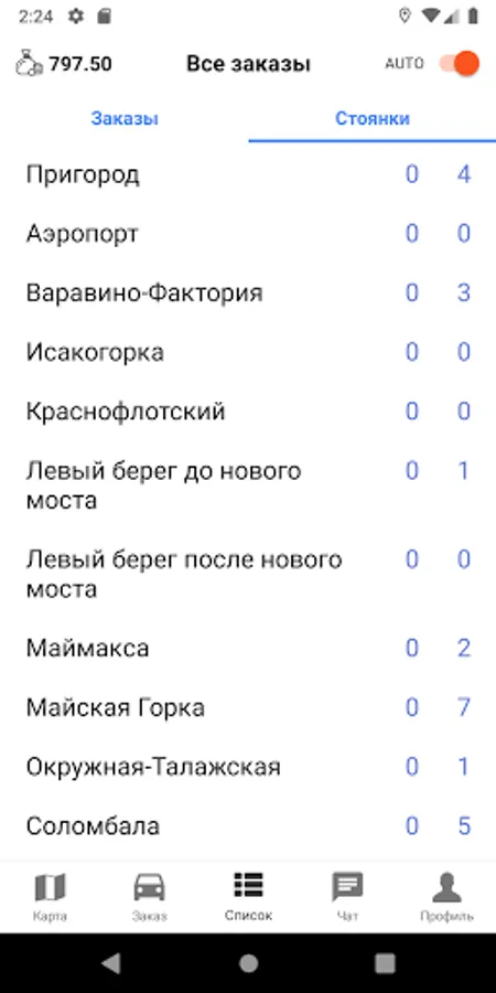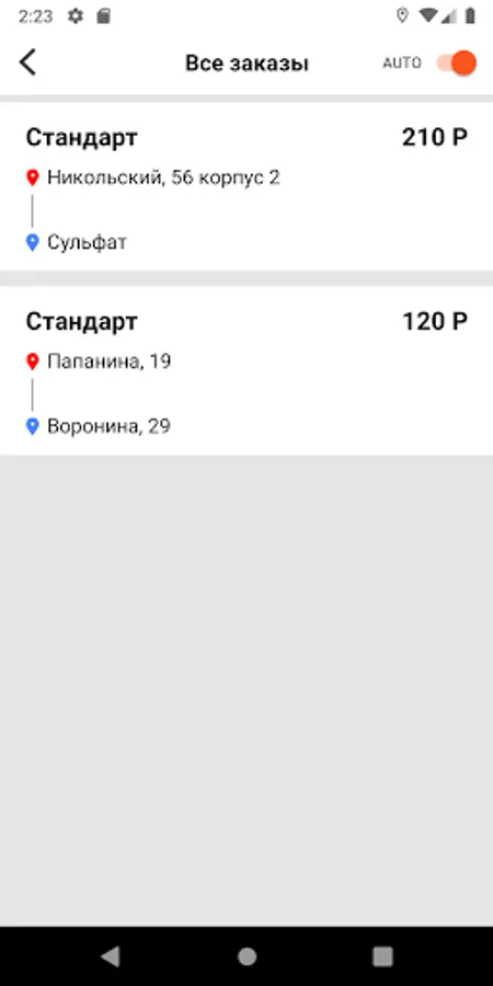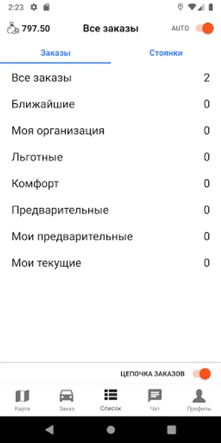 You can choose convenient orders from the list using filters by rate and end point of the route. Or turn on the mode, in which the service automatically suggests the nearest orders, and fulfill them one by one. This way you can earn more while saving time and fuel.