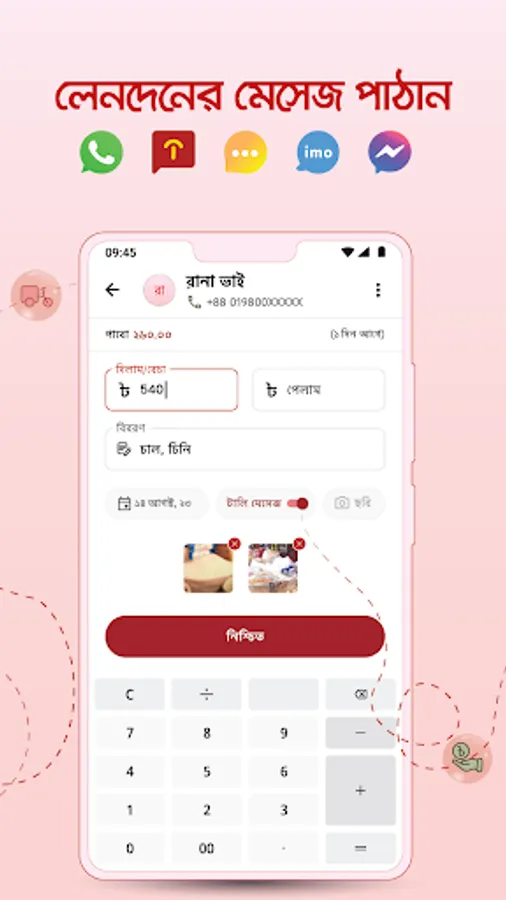 A record of each transaction can be sent to the rest of the customers and suppliers. Add details, store name, address and other information to the transaction message and send it to the customer via imo, WhatsApp or Messenger. There will be no more misunderstandings regarding balance amount and payment calculation. Accounts are clear and relationships are good.
