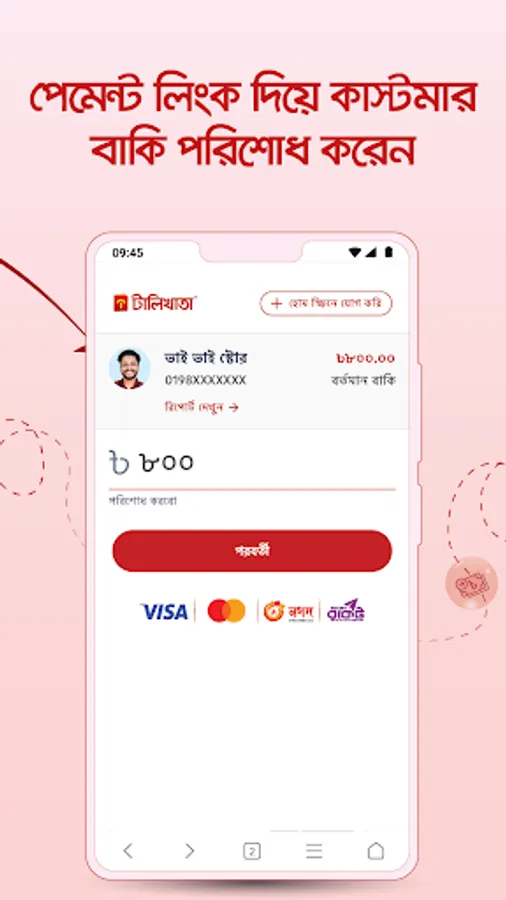 Send payment link to customer from Talikhata app via Transaction, Taga or Collection message. Through the payment link, the customer can pay the balance using his cash, rocket or debit/credit card and can make cash payment.