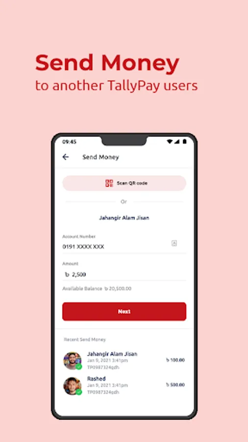 Send money instantly to other TallyPay users. You just need to enter the recipient's TallyPay account number and amount.