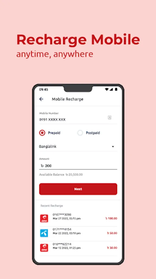 Recharge any mobile instantly. Both prepaid recharge and postpaid bill payment of all operators are available: