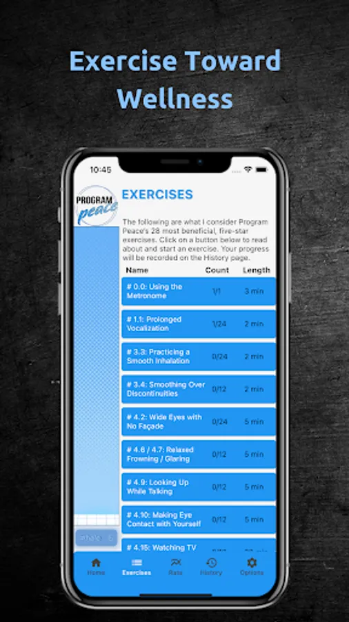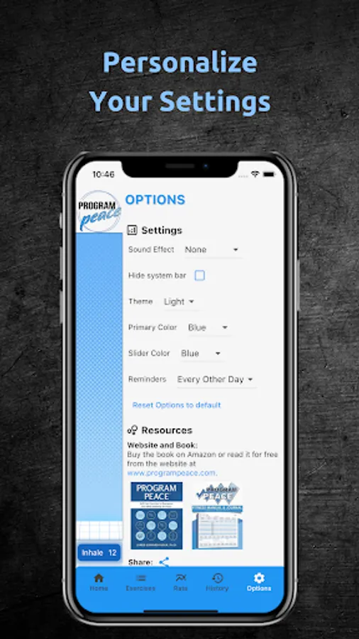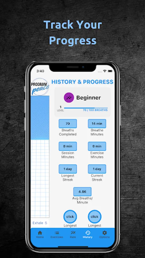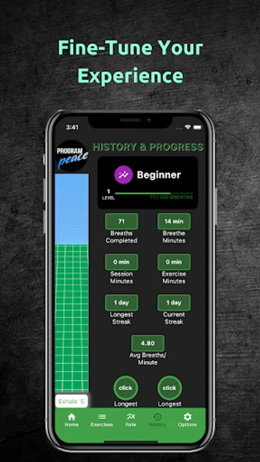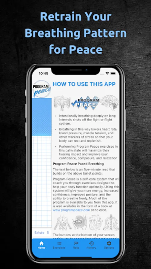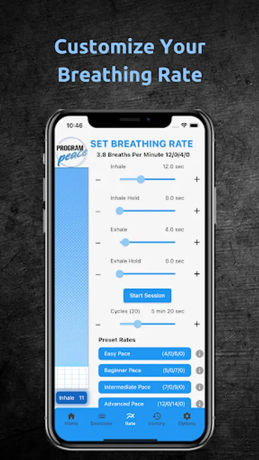 Read about the science of optimal breathing. Select how long you want your inhales and exhales to be. Choose the duration of the optional pauses between them. Peruse the preset breathing rates to learn about various breathing methods. Practice the Program Peace exercises to build confidence, a positive mindset, and rehabilitate systems throughout your body.
