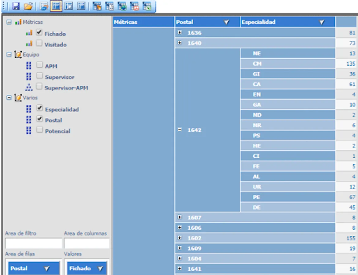 It has available information on coverage, prescribers by market, doctors with high prescriptive power who are not visiting, detection of competing prescribers, detection of the degree of commitment of the doctor with the representative / laboratory, etc.