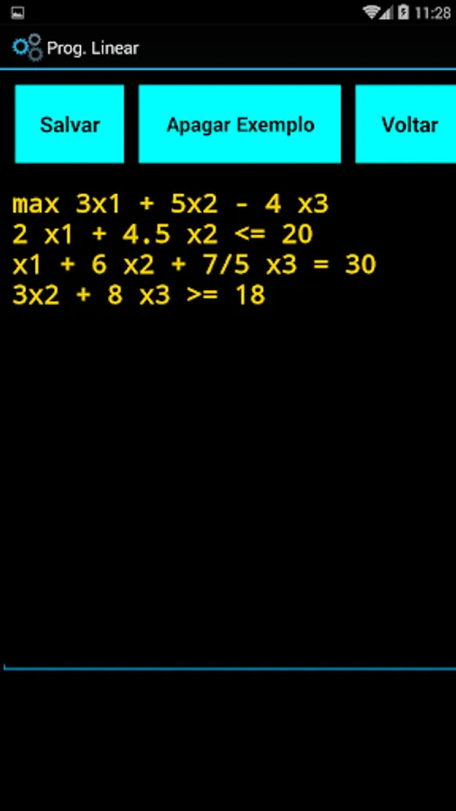 The application allows solving "classical" Linear Programming problems with up to 10 decision variables and 10 constraints. After the data entry, the application shows each step of Simplex showing, in each iteration, the basic solution with all the coefficients of the variables as well as the variable that enters the base (incoming) and the one that leaves the base (outgoing).
