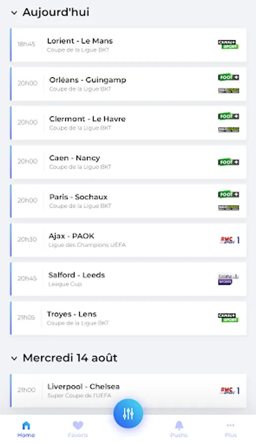 At a glance, prepare your tv football evening with your Football Program application. A match in the Champions League or your favorite team tonight on French TV, and you just have to turn on the TV set and sit on your sofa.