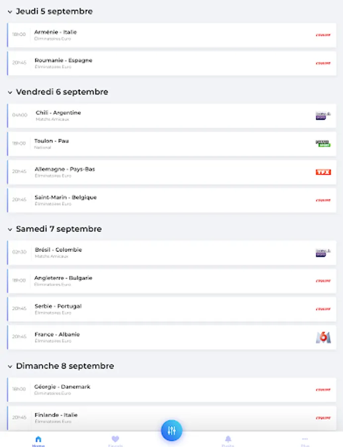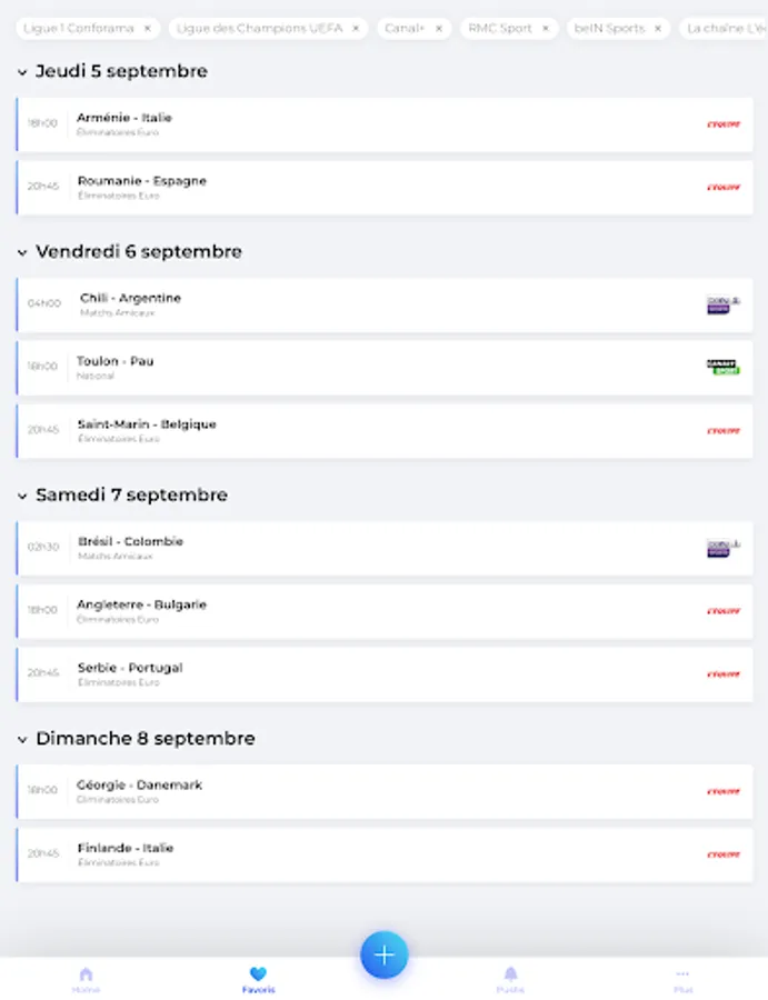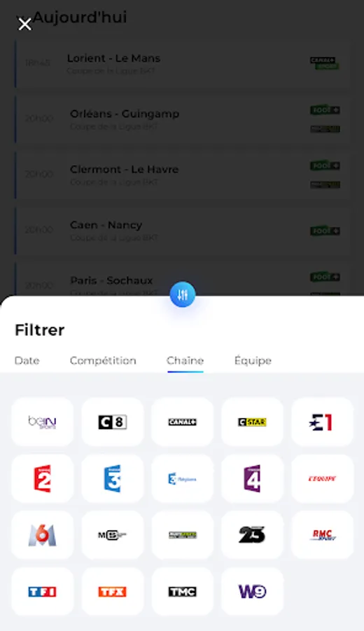 Channels available in this TV football program application: Bein Sport, RMC Sport, Canal +, Canal + Sport, Foot +, Eurosport, Foot +, Multisports, Ma Chaine Sport, TNT channels, TF1, France 2 , France 3, France 4, M6, W9, Direct 8, BFMTV, TFX, TMC, The team ...