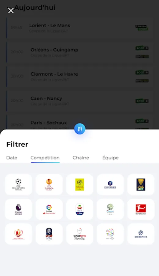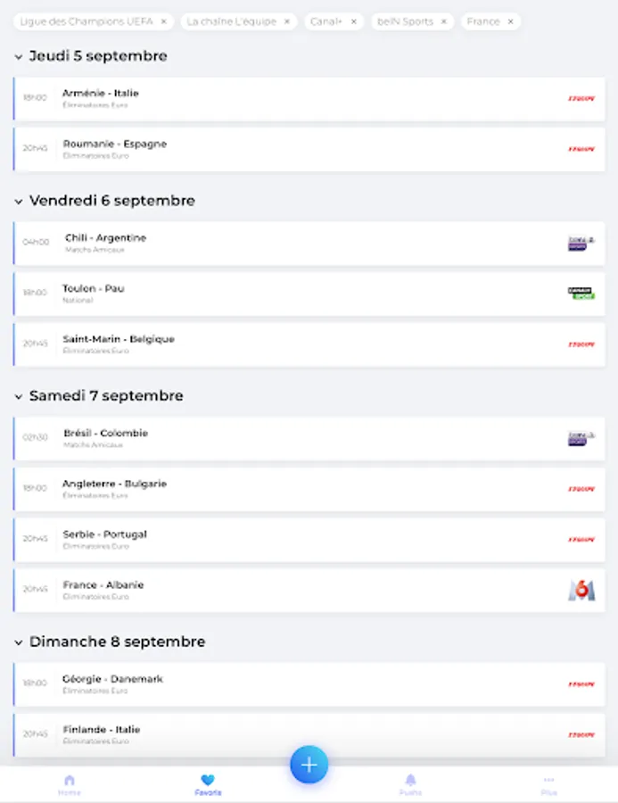 Thanks to the app, never miss a live match of your favorite teams, channels and competitions by viewing the daily updated schedules on your personalized TV guide.
