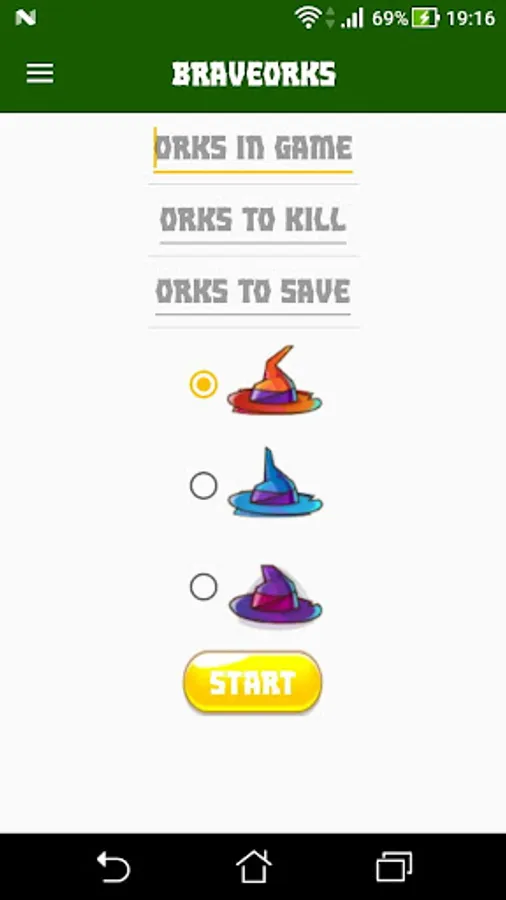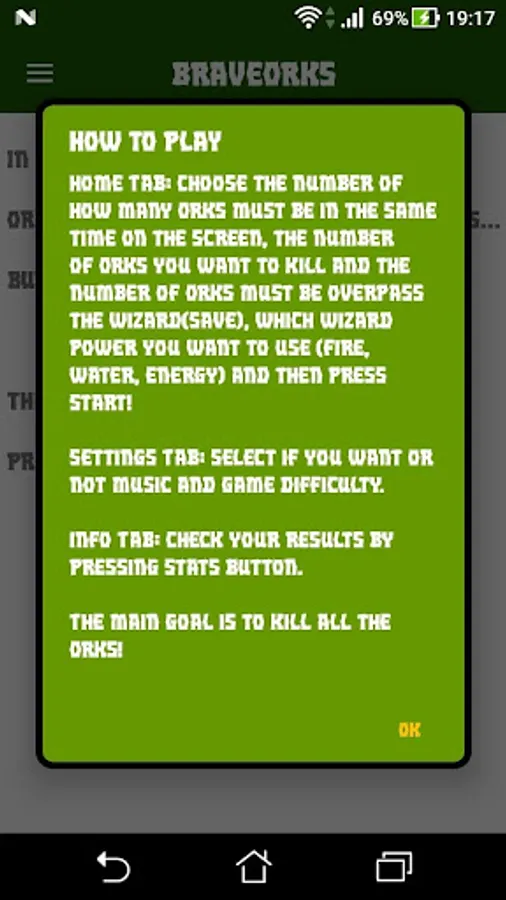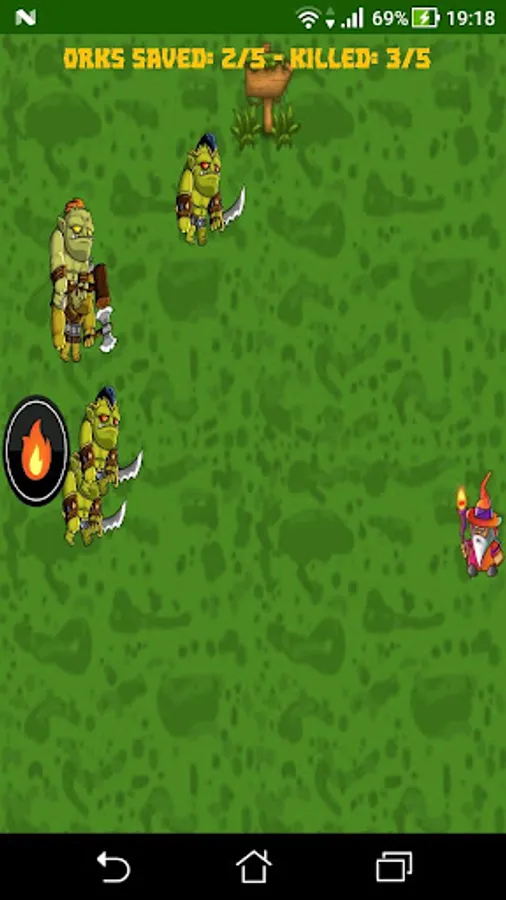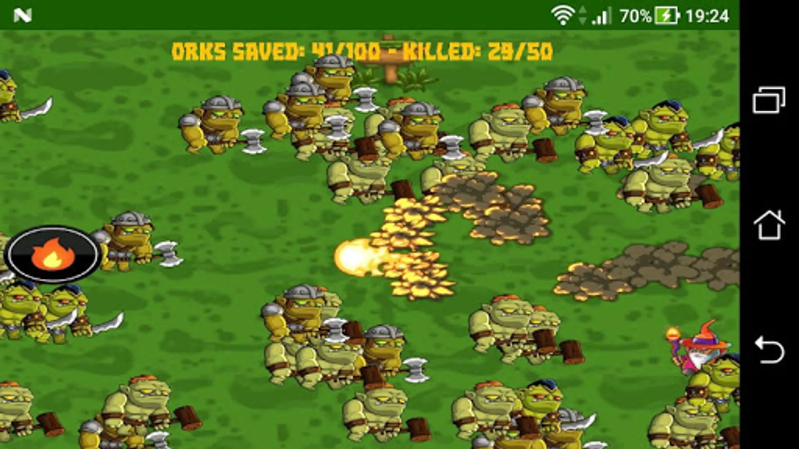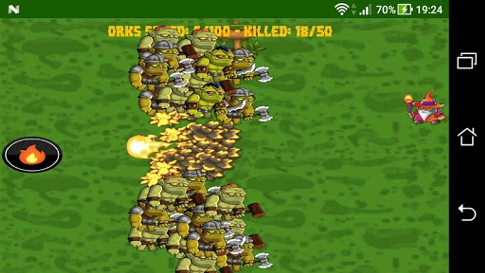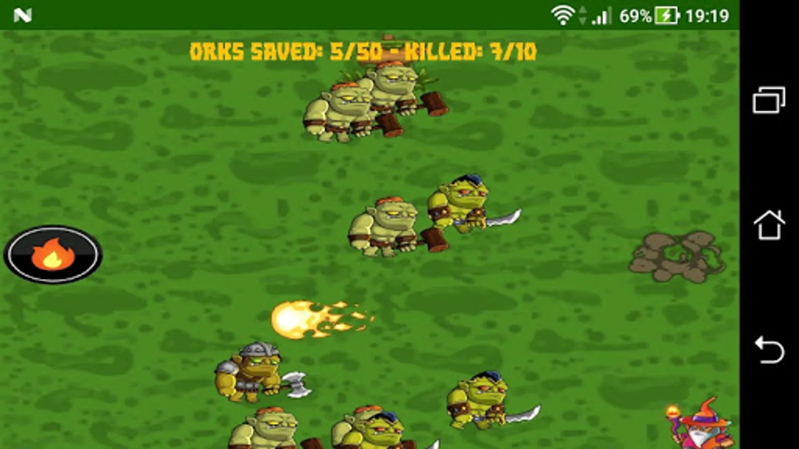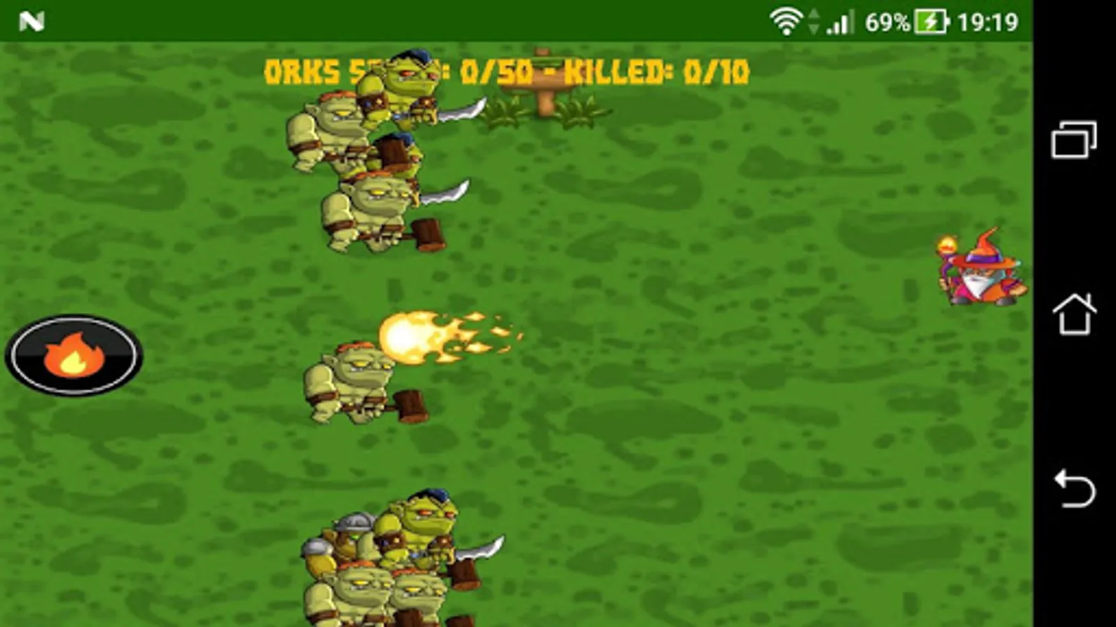 Choose one of 3 wizards: Fire, Water or Energy and kill the Orcs with the wizard's magic (tap the button on the top-left and move the wizard up and down touching the screen). If the Orcs overpass the wizard, you loose, otherwise if you kill a lot of them, you win!