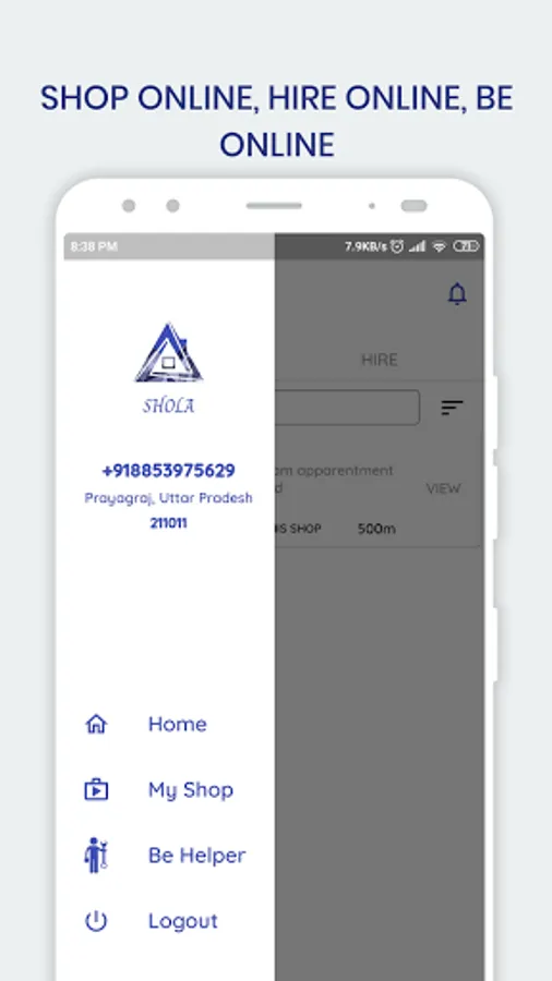 > You will get two sections on home screen “shop” and “hire” if you want to buy products then select shop and if you want to hire worker then select hire.