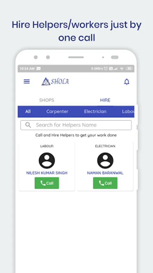 > In HIRE section you will find workers list, just tap on the call button to talk and hire and get your work done.