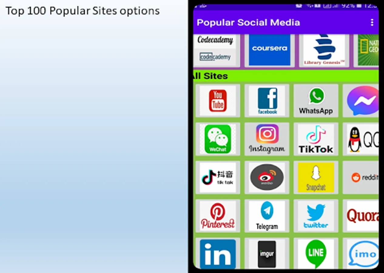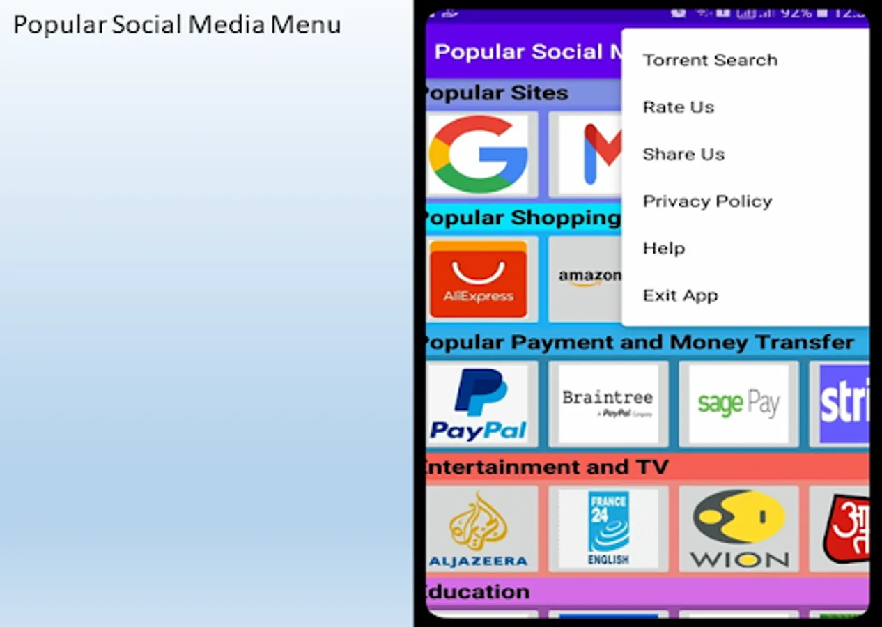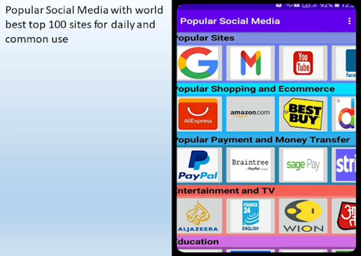 This application is free and purpose of this application is to provide user a fast and reliable service of most used websites and application. Application is divided into different section of popular sites, popular shopping and ecommerce sites, popular payments and money transfer, Entertainment and TV, Education and All other popular 100 daily using sites and media.