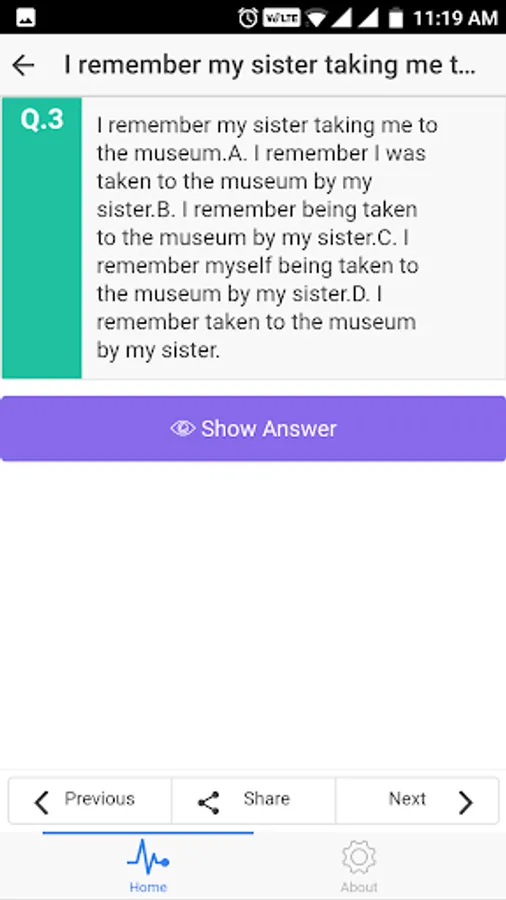 3. Provide an option for users to practice his/her own answers as your application will present you with a question. User can think of his answer then compare how his answer is different from our answer.