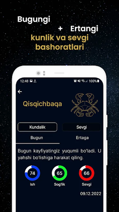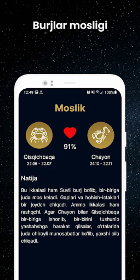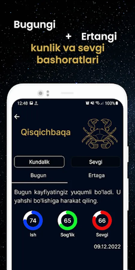 Munajjimlar bashorati - kundalik va sevgi bashoratlarini berib boruvchi bepul ilova.Dastur yordamida bugungi va ertagi bashoratlarni va burjlar mosligini bilishingiz mumkin.