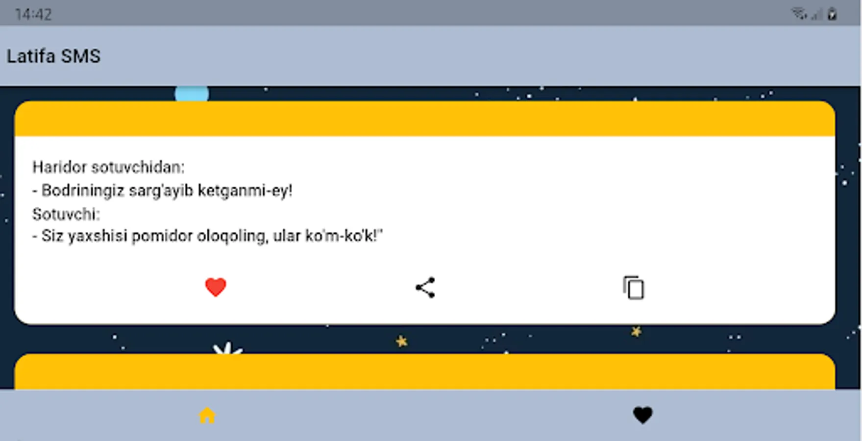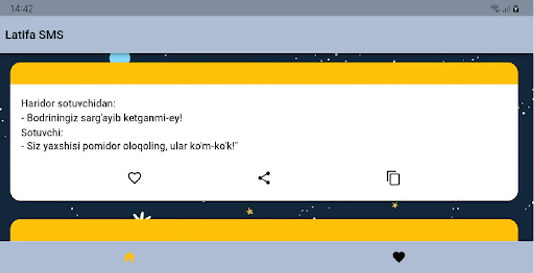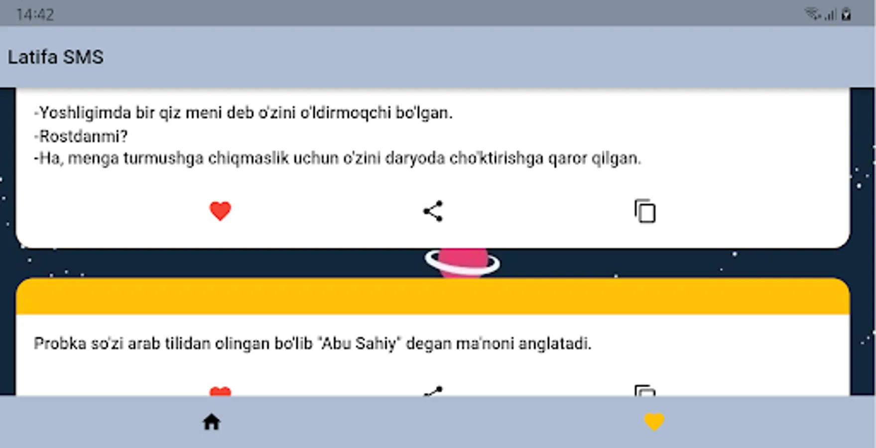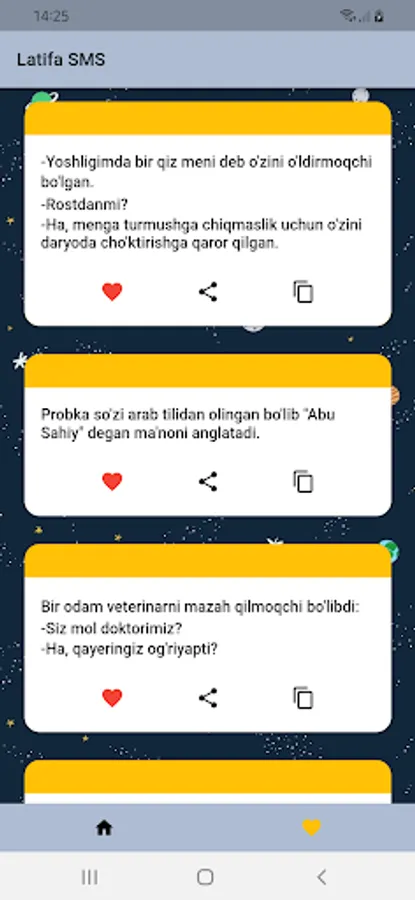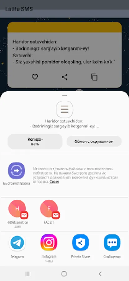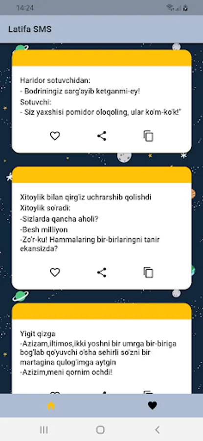 Ushbu Latifa SMS sizga qiziqarli latifalarni taqdim etadi. Siz ushbu latifalarni o'qishingiz mumkin, do'stlaringiz bilan ulashishingiz mumkin va sizga yoqib qolgan latifalani saqlab quyishingiz mumkin.