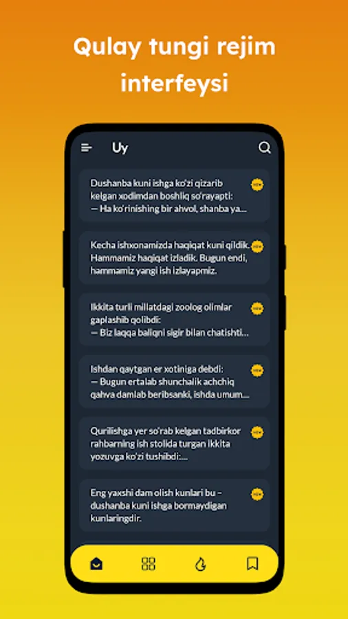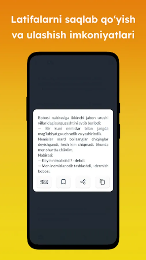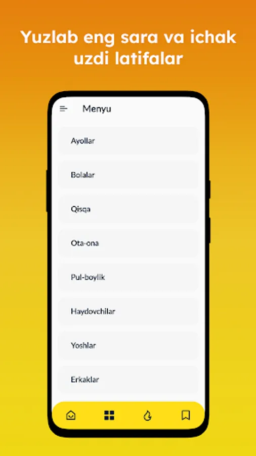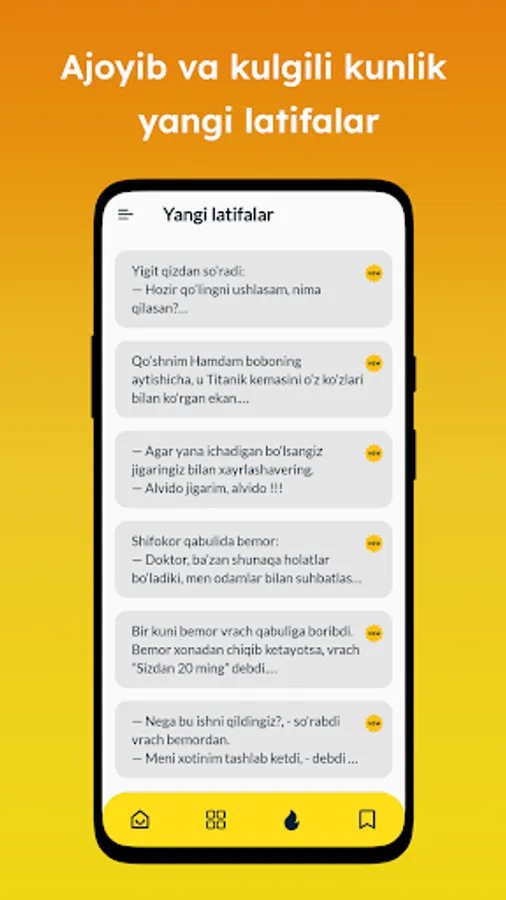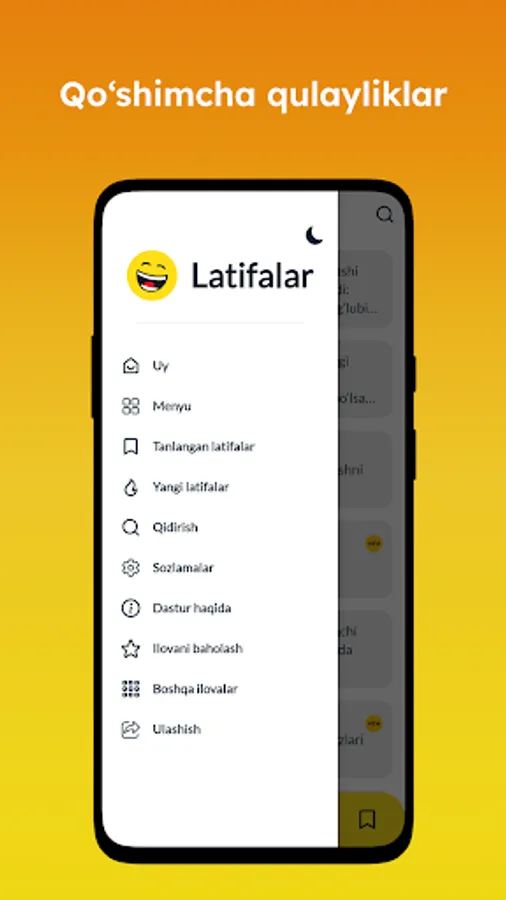 Latifalar - mobil ilova har kuni yangi va eng sara ichakuzdi latifalar, hangomalarni taqdim qiladi. Turli xil mavzulardagi eng zo‘r latifalar : ayollar, bolalar, qisqa, ota-ona, pul-boylik, haydovchilik, yoshlar va yana ko‘plab mavzularda latifalar o‘z ichiga oladi.