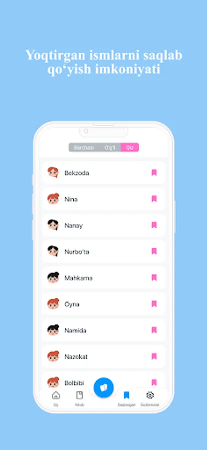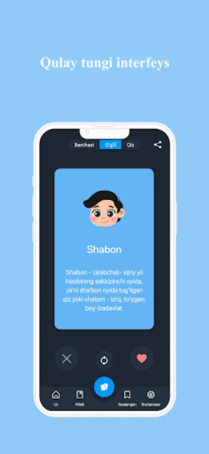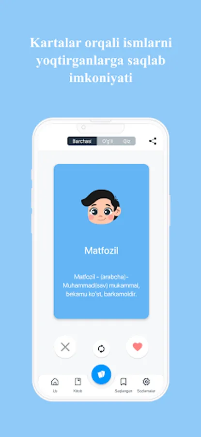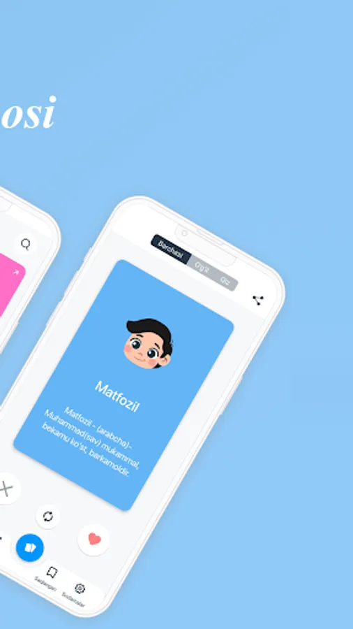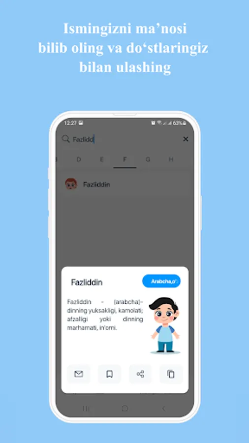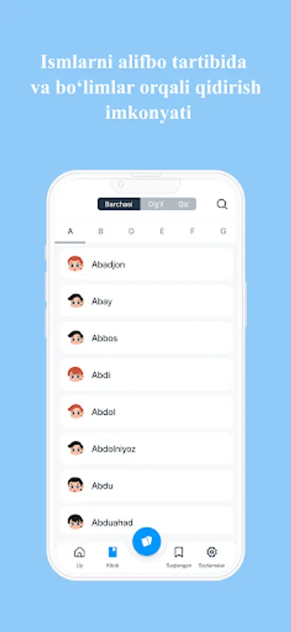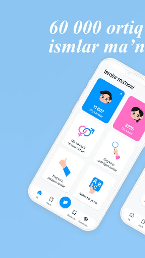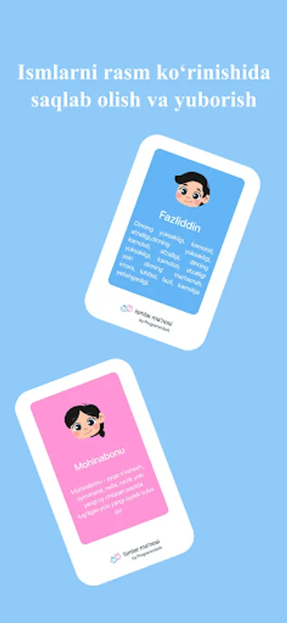 Ilova orqali siz 60 000 ortiq ismlar ma’nosini bilib olishingiz mumkin. Dasturda o‘zbekcha,inglizcha,ruscha, azarbayjoncha ismlarni ham o‘z ichiga olgan.Ushbu dastur orqali o‘zingiz va yaqinlaringiz ismlarining ma’nolarini qulay va sodda interfeys dastur orqali bilib oling. Farzand kutayotganlar uchun juda ham foyda bo‘luvchi dastur. Dasturni koʼchirib oling va farzandlaringizga goʼzal ismlar tanlang. Ilova ismlarning ma’nosini bilib olish uchun ko’plab qulayliklarga ega.