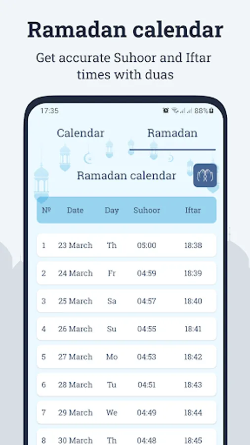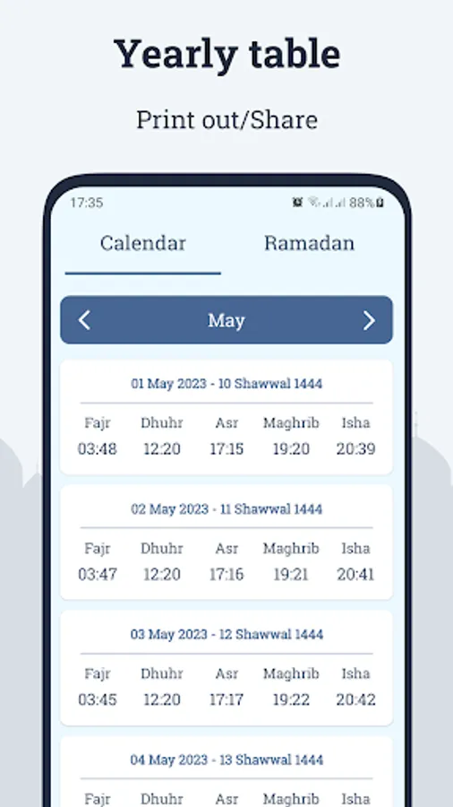 • Prayer times (Fajr, Dhuhr,Sunrise, Asr, Maghrib, Isha)