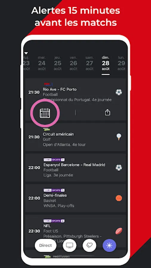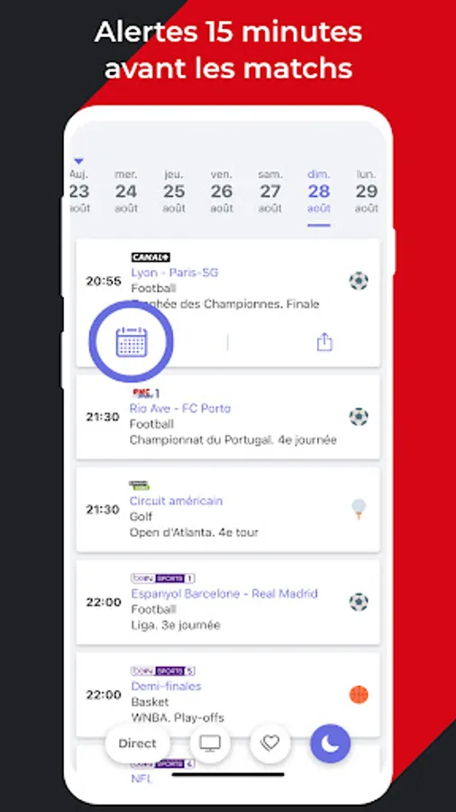 Be alerted 15 minutes before the matches thanks to the reminders added to your calendar!