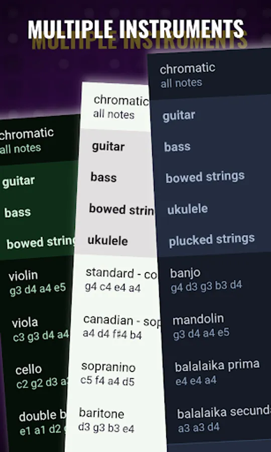 • Popular tunings for instrument included, but it is a chromatic tuner at heart
