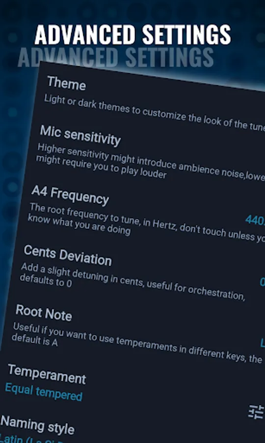 • Change the A4 frequency to 440Hz or 442Hz or ANY number, the starting note, multiple themes and more!