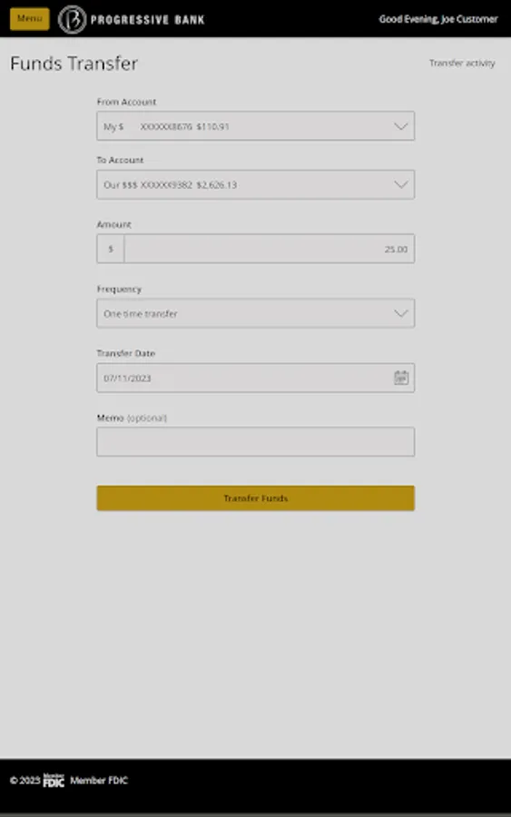 TRANSFER FUNDS – Quickly transfer funds between any of your Progressive Bank accounts or to your accounts at other financial institutions