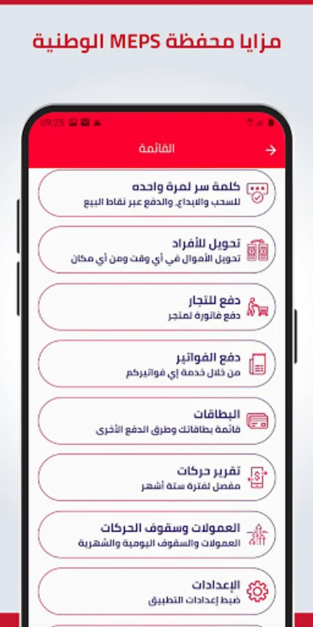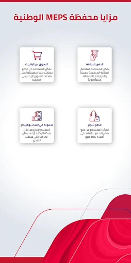 MEPS National Wallet offers payment services, using the mobile phone, by storing or keeping financial values that can be transferred to others to fulfill financial dues, and allow users to take advantage of other services provided by this unique electronic wallet.