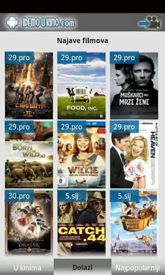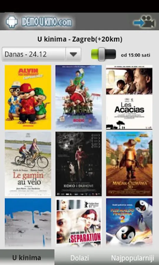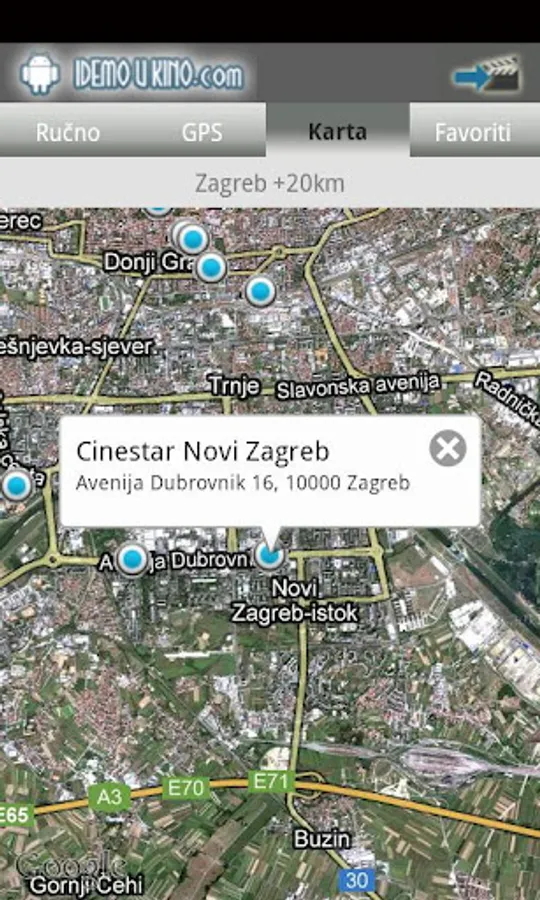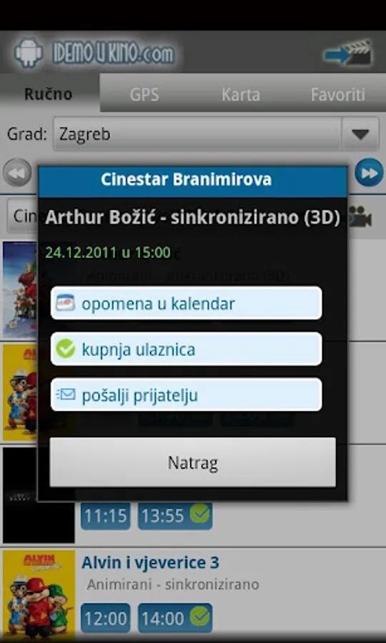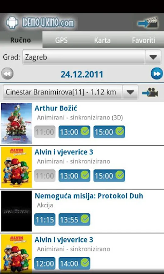 - pretraživanje kino programa putem trenutne GPS lokacije telefona