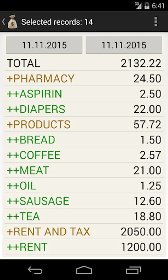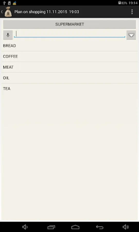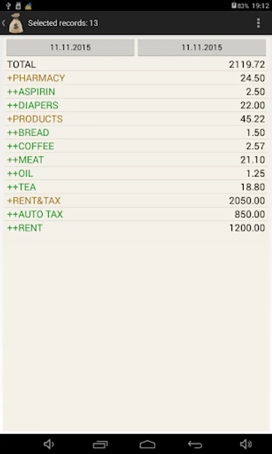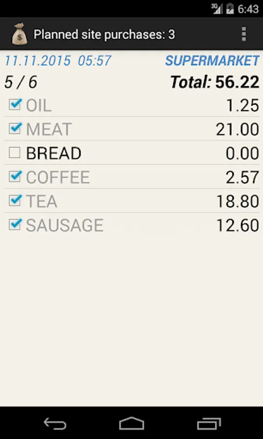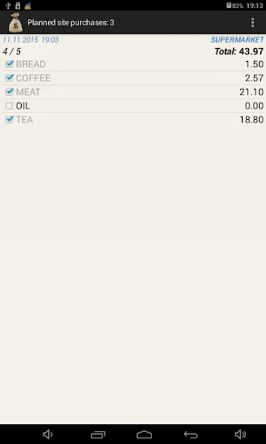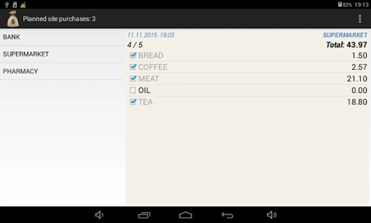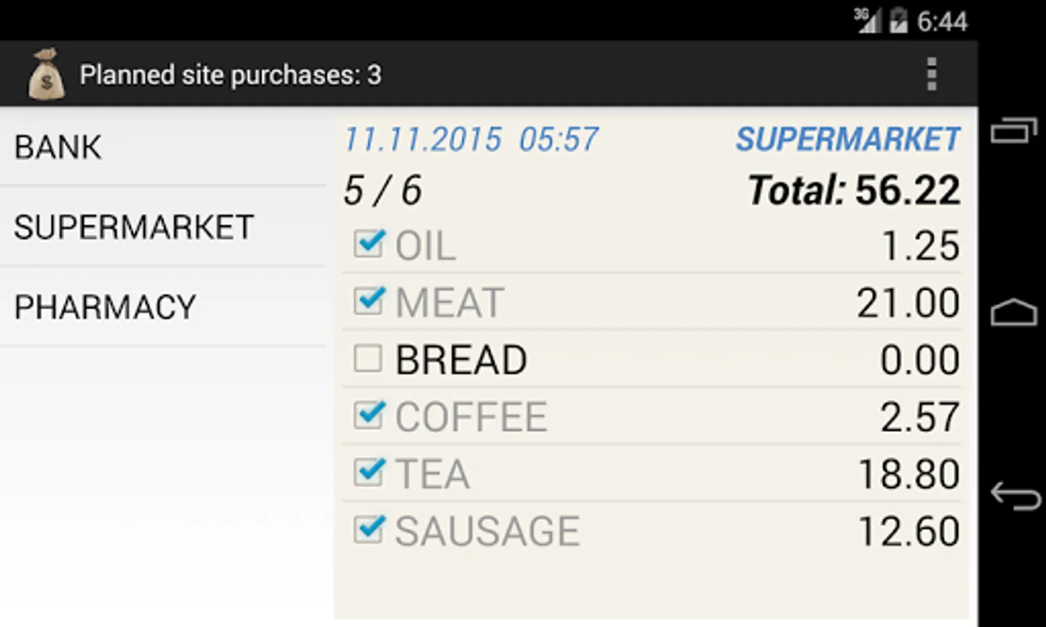 After a couple of weeks of using the application, "Shopper" you'll see a complete picture of your expenses. All a waste will be revealed and you go away feeling that money is spent like water through your fingers.