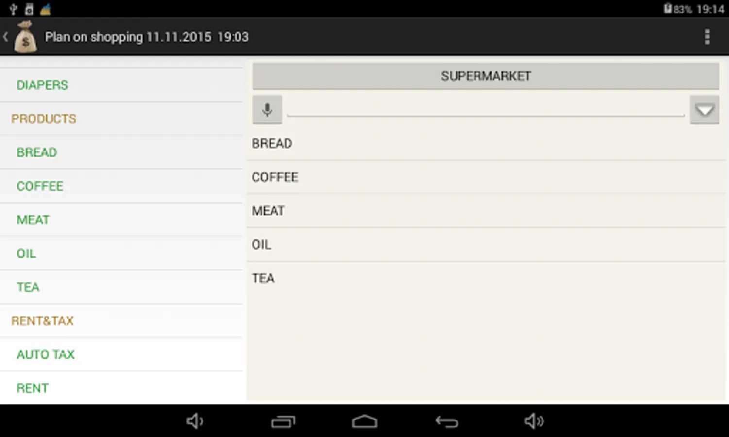 Before going to the store, many people make a plan on paper purchases, and rightly so. After making a purchase, many people write down their costs, and also doing the right thing. We disclaim bills. Application "Shopper" offers a different approach - dictate by the plan of purchases in one click to make a purchase note, dictate the amount. And this is all! All your purchases into account! In the same way it is possible to take into account other costs - taxes, interest on loans, penalties, etc. You can then analyze all your expenses for any period of time and for any category. You will know exactly when and what to buy and how much spent.