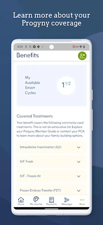 The Progyny Member Portal app is self-service tool to view your benefit details, communicate with your Progyny Care Team, pay bills, and access fertility and family building education.