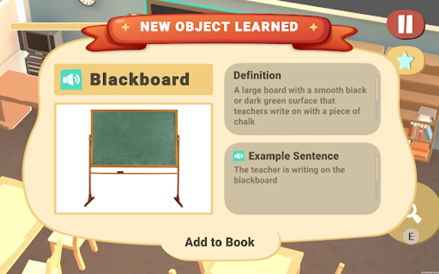 Earn diamonds while you play and spend them on buying various cosmetic items for your character, 3D objects to unlock in the 3D model viewer, and stickers. Children of a young age will enjoy these cute backgrounds and satisfying sounds. We make it easy for you to review all your vocabulary in the game via our encyclopedia called "Book". The book will offer all the words you learn in the game and display all related information about them, like phonetics, pronunciation, real-life images, and example sentences. For kids who love to draw, we present you with a whiteboard where you can draw anything with any color you like and stamp stickers you buy in the shop.
