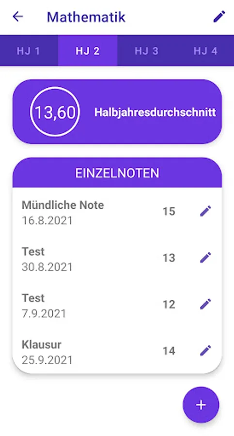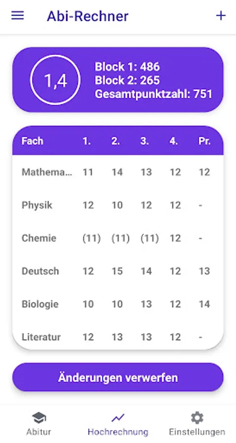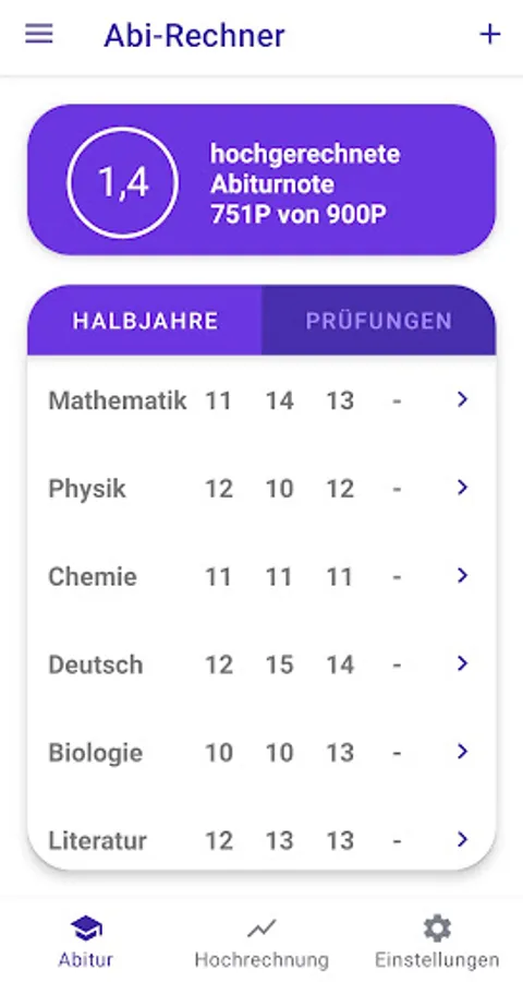 - Clear presentation of the data for individual Abitur subjects / individual semesters / all subjects in the Abi-Calculator Hessen