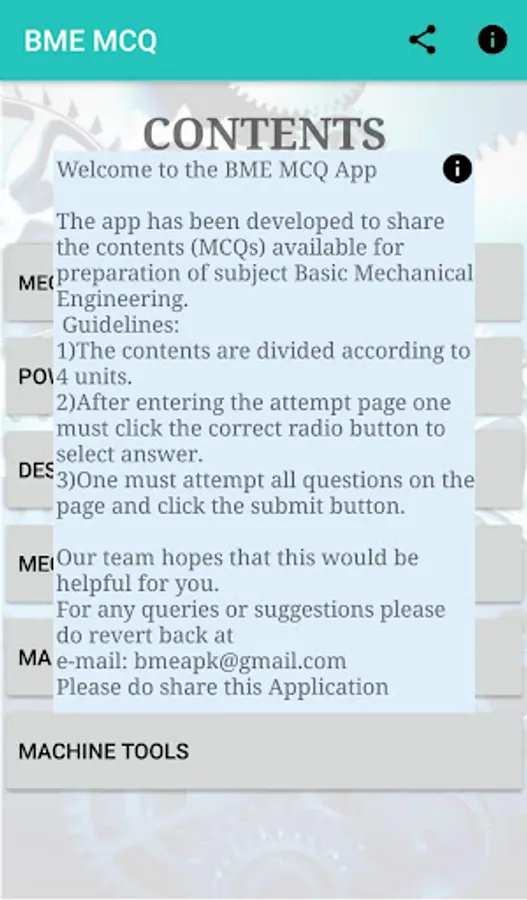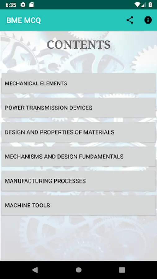This Application consists of multiple choice questions of Basic Mechanical Engineering on different topics.