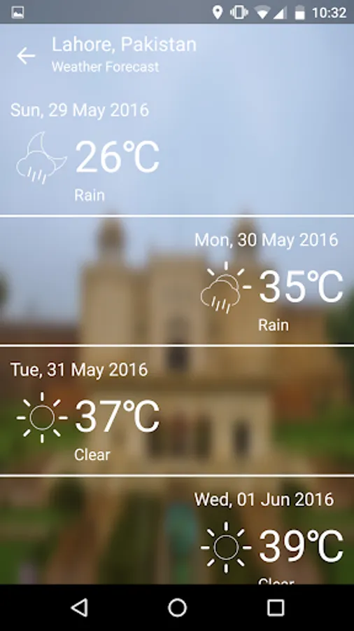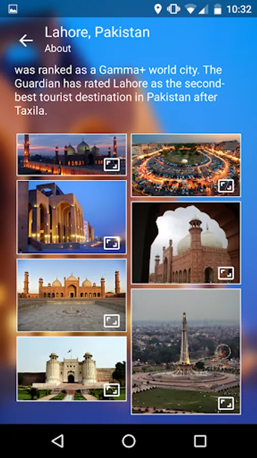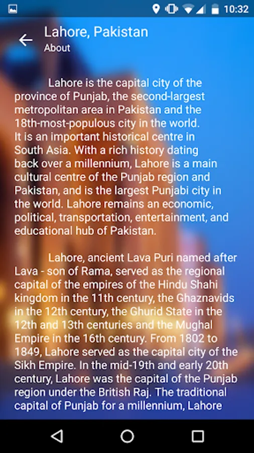 A good guide to new comers and tourists in the city of Lahore. It lets you extract information of Lahore enjoyment places, sleeping places and eating places as well as gives you updated weather forecast of 7 days and a bit of history of Lahore city. You can select your favorite places in this app also. To access this information you will need your location and internet to be turned on in your mobile phone.