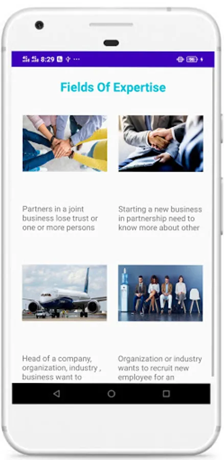 Few names/buttons(Mission, Vision, About us, Field of Expertise) of their work/services also mentioned in this App so that user can contact as per his desire.