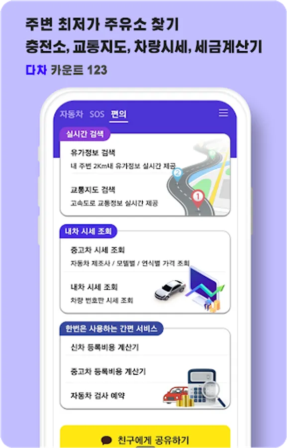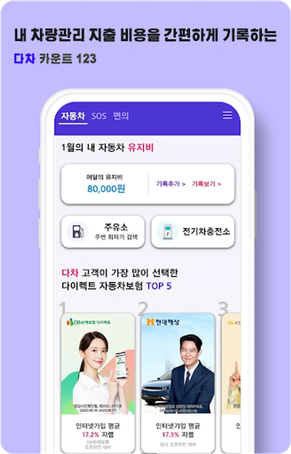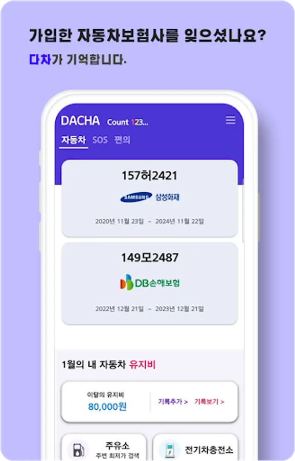 Used car price by my car number / Find the cheapest gas station nearby / Insurance wallet / Cost management