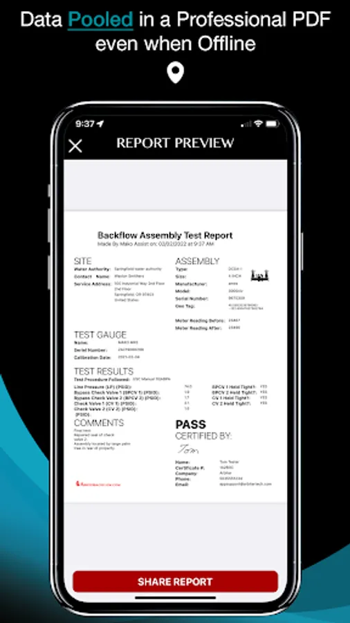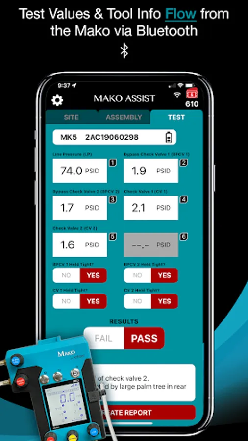 The Mako Assist app allows backflow testers to ditch the notepad! Through the power of Bluetooth technology (included in every Mako) Backflow test values are automatically sent to your phone where they are labeled and prepared for reporting. Mako Assist allows testers to easily input essential information to generate a professional report with or without an internet connection! It's backflow reporting that Flows!