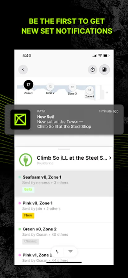 KAYA is community-focused. You’ll be notified when your buddy breaks into a new grade so you can leave ‘em a fist-bump and a comment. In-app messenger allows you to connect with other climbers, and, if your gym is on KAYA, receive new set notifications when the routesetting team finishes slinging the freshies.