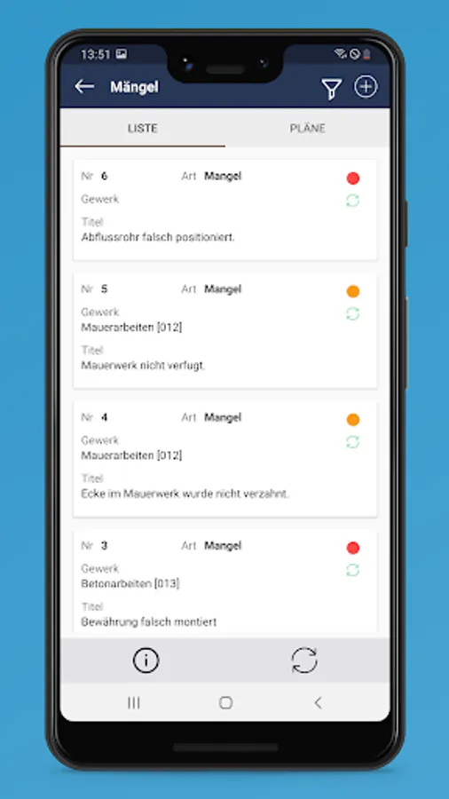 This makes projectdocu your insurance against unjustified additional claims by third parties, even if they only arrive after completion. Use the universal tool for your defect management to keep track of all construction defects. Central management, quick setting of deadlines and easy status tracking, including Excel export of the lists of defects.