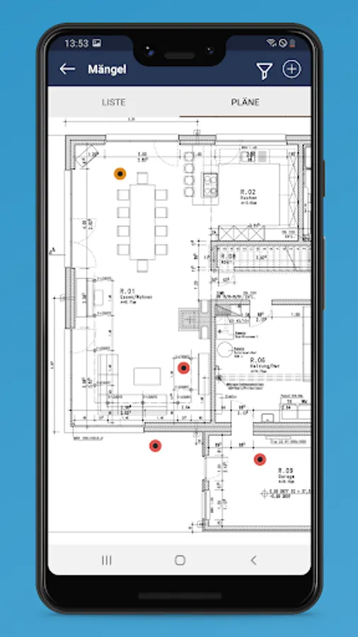 Automated location of the photos using GPS or simply tapping on the screen. Assign a position and viewing direction in the construction plan to each photo as soon as you take it. All plans are available offline for localization on your mobile device. Everyone involved can see at a glance which component a photo, a voice memo or annotation belongs to.