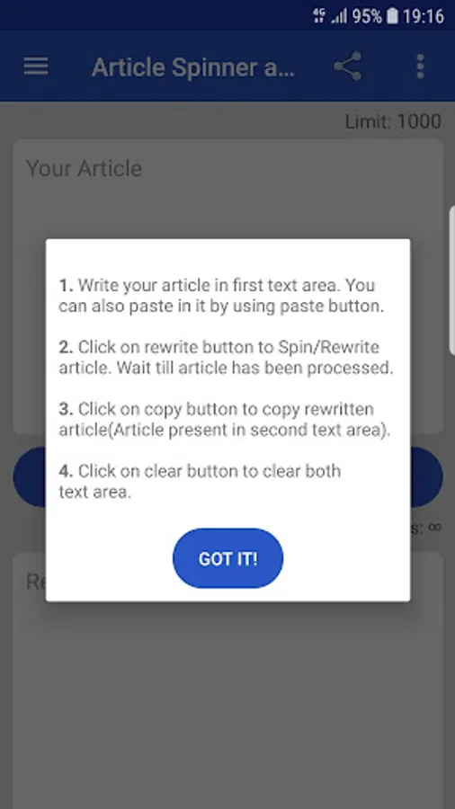 Professional Article Spinning and Rewriting Tool. It is used to create unique content. Submit your article and this application will turn your article into a unique article. Article Spinner and Rewrite provides a unique article without changing the meaning of the submitted article. Spin or Rewritten Articles contain different set of words that represents the same meaning. Rewritten article is well formatted too. That makes it suitable for professional use.